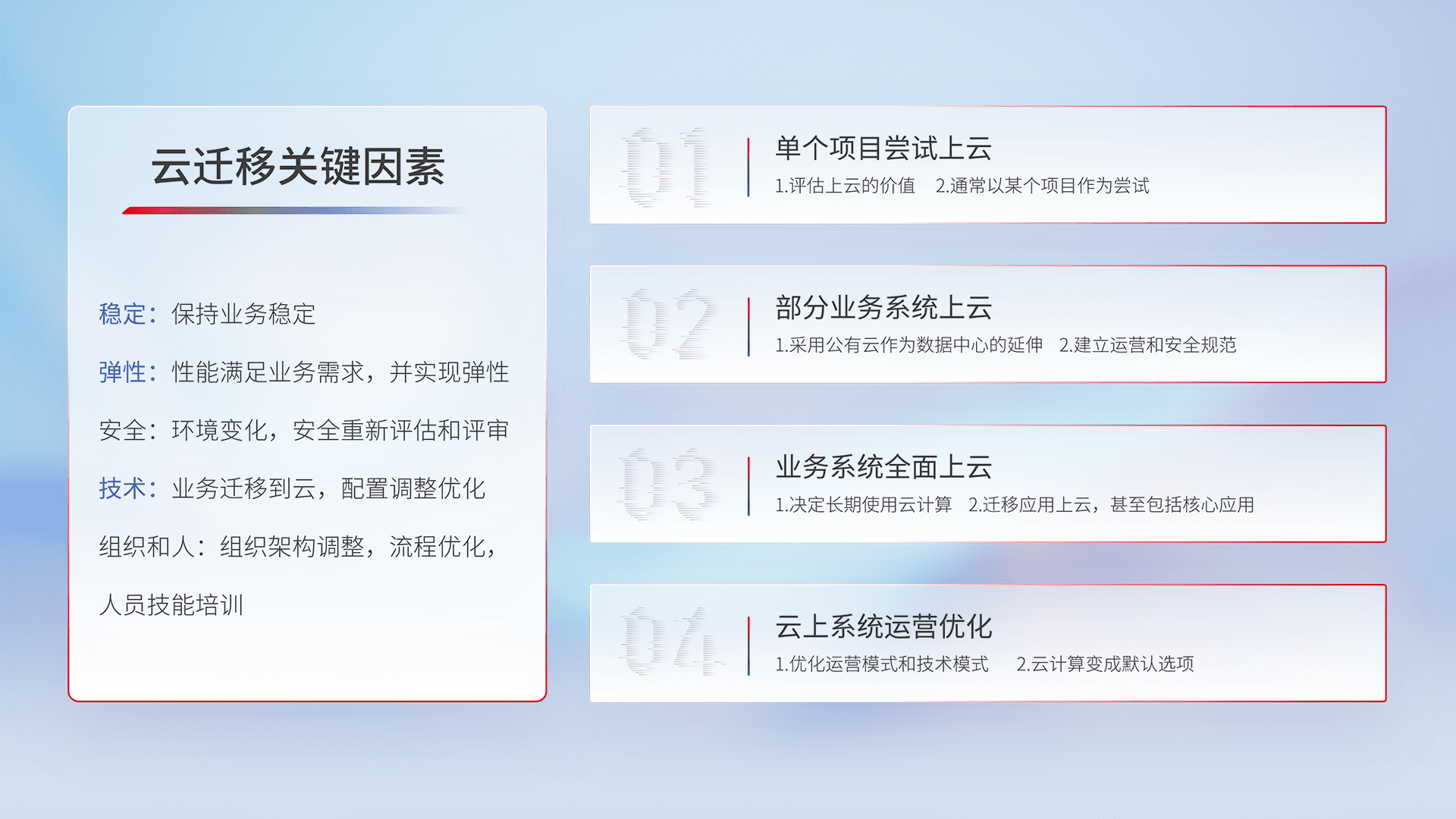 结合实际业务,,,,从规划设计、、云平台选型、、、、云原生改造、、、、数据迁移、、、、集成交付,,迁移全过程为客户识别最佳上云路径,,,做好风险识别管理,,设计网络架构、、、身份权限、、、、安全审计合规、、、、操作审计、、、日志审计、、、监控告警策略、、、、多站点容灾设计等,,,对云上基础设施进行整体规划,,,,提升IT治理水平,,,,以满足弹性、、高可用、、、、高性能的需求。。。。