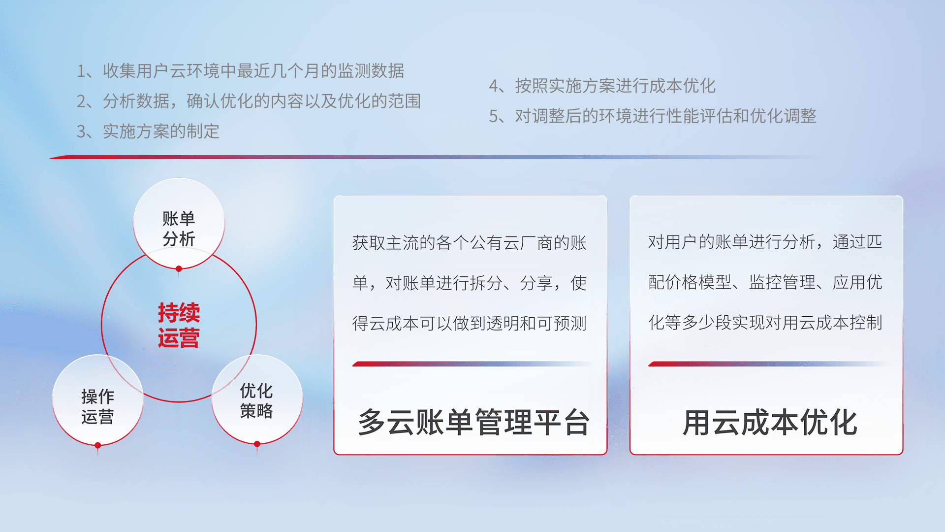 通过多云纳管,,,以统一的资源数据模型把客户的云资源进行抽象和封装,,进而实现对多云资源的统一操作,,,,保障云资源管理的可靠性、、稳定性与可用性。。。量身定制化运维内容,,配置、、、开发运维、、、、补丁管理、、、、备份、、、、监控、、、、认证和访问管理、、、、审计和日常巡检等,,保障在用云过程中的可靠度,,,稳定度以及高可用率。。。