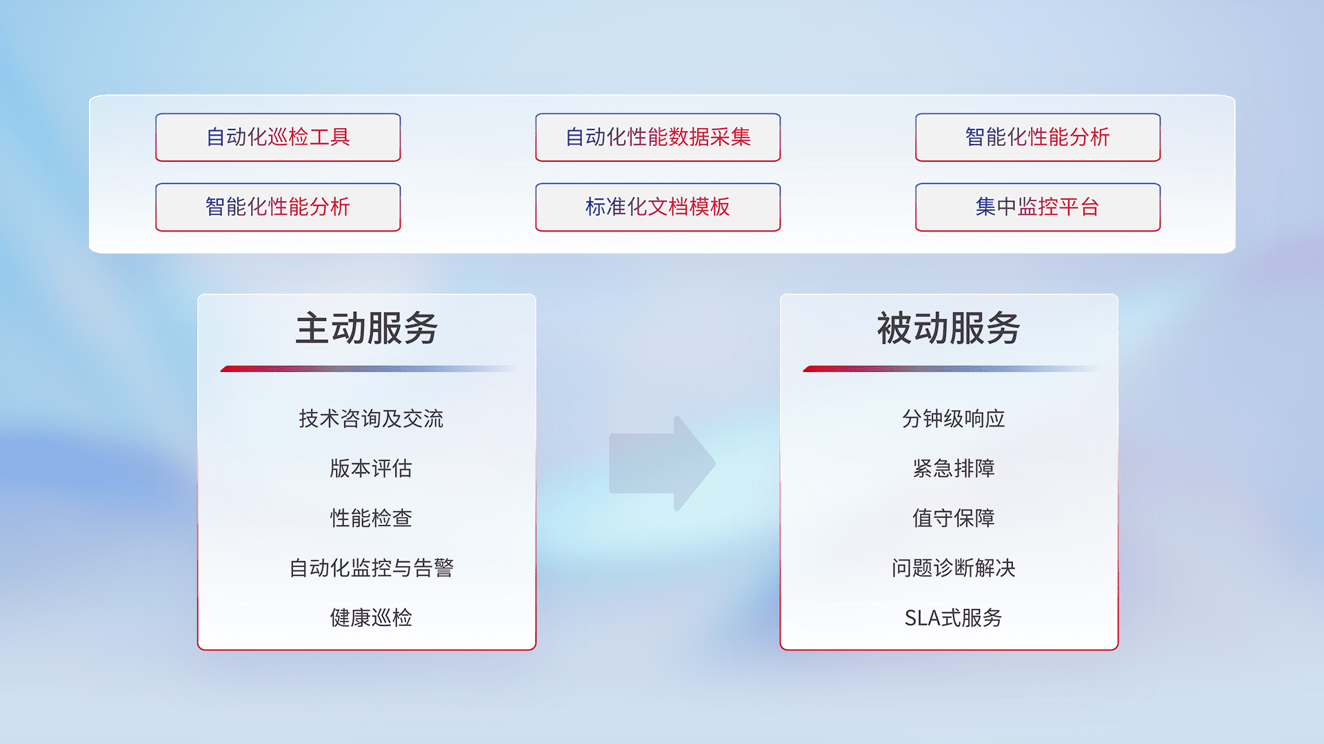 智能化工具和标准化文档,,,保障服务质量,,,,提供主动服务(包含技术咨询、、版本评估、、性能检查、、、、自动化监控与告警、、、、健康巡检)和被动服务包含(分钟级响应、、、紧急排障、、、、值守保障、、、问题诊断解决、、、、SLA服务)。。。